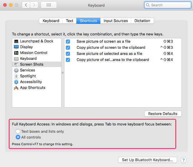 Enabling Tab access for the Firefox browser in the Keyboard preferences on MacOS.