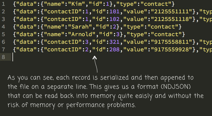 As for the NDJSON format stuff, this is totally ingenious. It's such a simple idea, but it completely eliminates the 'out of memory' issue. I always squirm at the thought of copying large chunks of file data into memory, especially when it's not always apparent, how much data needs to be copied.