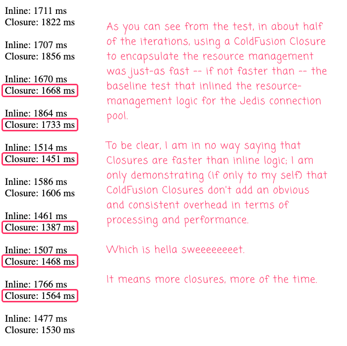 One of my favorite use-cases for the Closure construct in Lucee 5.3.2.77 is to simplify interactions with a managed resource. For example, instead of explicitly requesting a resource from a connection pool, consuming it, and then returning the resource to the connection pool, I can create a method that manages the resource allocation for me and simply invokes a callback, providing the given resource as a callback argument. This way, the calling context doesn't have to care about the connection pool at all. That said, the one thing that always makes me nervous about this approach is the possibility that the closure-based workflow is adding a lot of processing and performance overhead. As such, I wanted to sanity check the overhead of creating and then invoking a closure in Lucee 5.3.2.77.