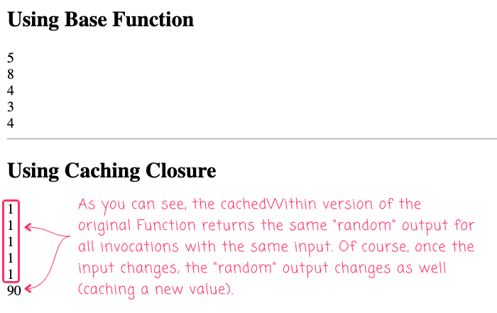 As you can see, when the cachedWithin Closure is invoked with no arguments, the same "random" value is returned 5-times in a row. This is because the first call to the proxy Closure cached the results of the underlying call to getRandomValue(); and then, each subsequent invocation of the Closure returned the cached value.