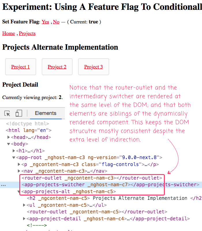 For the purposes of this demo, the UserConfigService holds the value of our feature flag, isUsingNewHawtness. When this feature flag is off, the existing ProjectsComponent is rendered; and, when this feature flag is on, the new and experimental ProjectsAltComponent is rendered. In either case, the selected component is rendered as a sibling to the intermediary component, which is, in turn, rendered as a sibling to the <router-outlet> component.