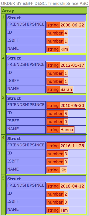 Here, the compound ORDER BY clause has been replaced with a native .sort() Array method. In order to implement the compound sort, we just have to have a cascading comparison in the sort operator. And, when we run the above ColdFusion code, we get the following output: