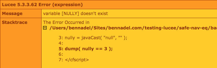 As you can see, Lucee CFML is not happy when we explicitly try to reference a null value. However, what if we bypass the nully variable reference and try to use the null value directly in the comparison: