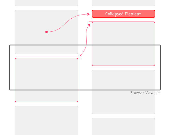 To understand the problem with naively collapsing content on a page, consider the following illustration that shows how the location of various elements on the page are changed when one of the elements is document-flow is collapsed: