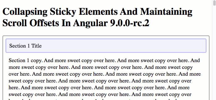 Now, if we run this Angular 9.0.0-rc.2 application in the browser and try to collapse a few sections, you'll notice that head Section header "sticks" to the top of the viewport when it is collapsed: