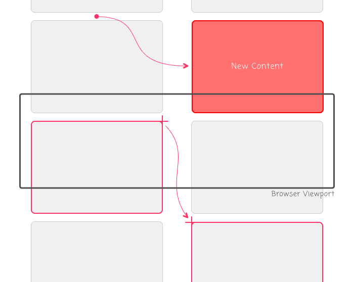 To understand the problematic user experience (UX) that is created when new content is added above the user's viewport, consider the following illustration that shows where the user's current reading experience (red outline) ends-up: