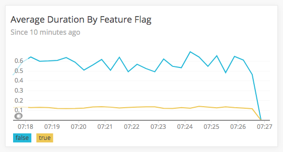 As you can see, roughly half of all incoming traffic is experiencing the new feature-flag-based logic (due to our randRange(0,1) mock roll-out). But, is the new logic performing better? For that, we can write another NRQL query that breaks-down the request duration by feature flag state: