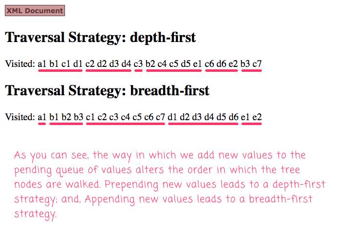 As you can see, when we use the .prepend() function to add new XML nodes to the front of the queue, we end up with a depth-first traversal of the XML document. And, when we use the .append() function to add new XML nodes to the end of the queue, we end up with a breadth-first traversal.