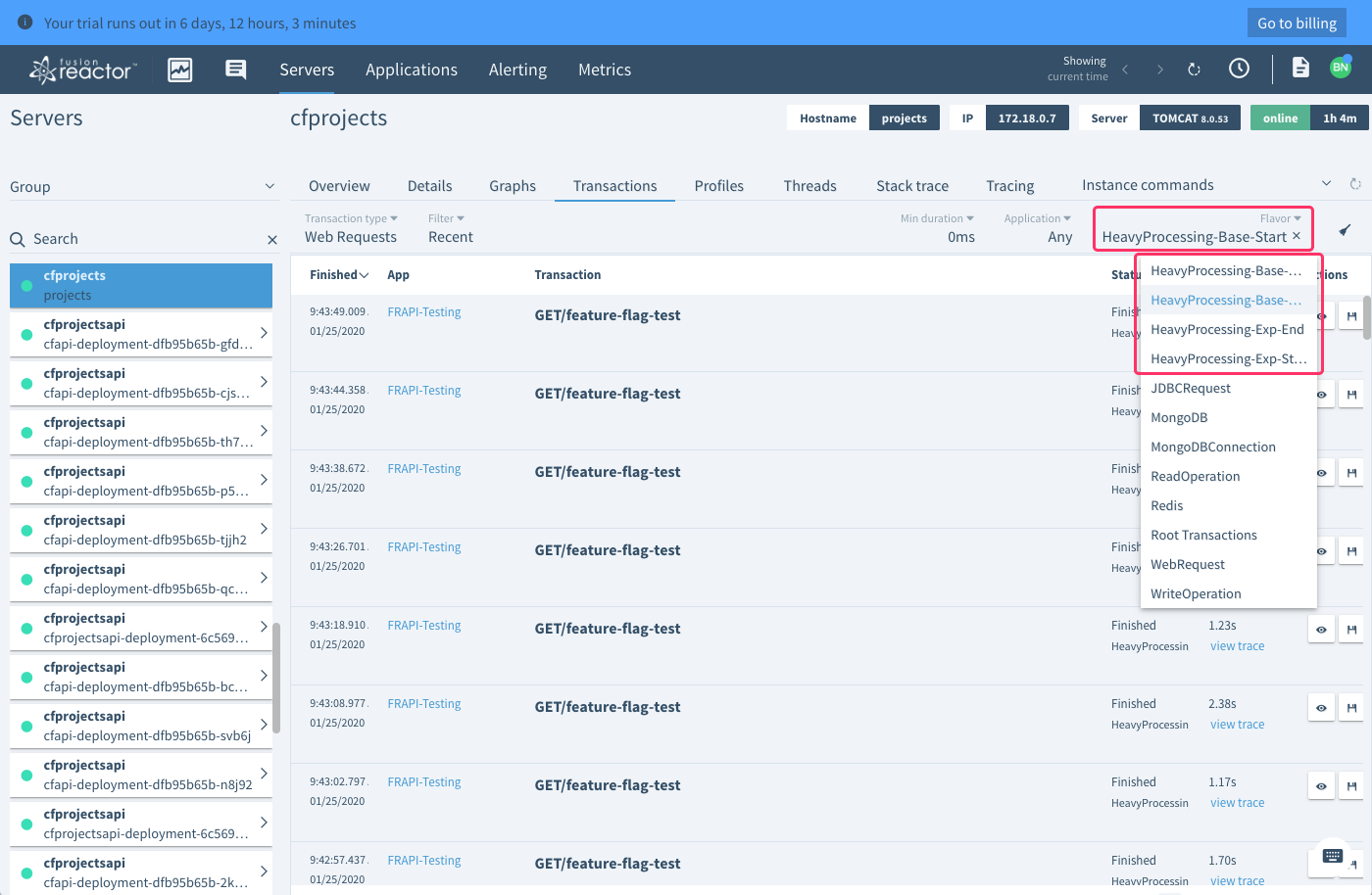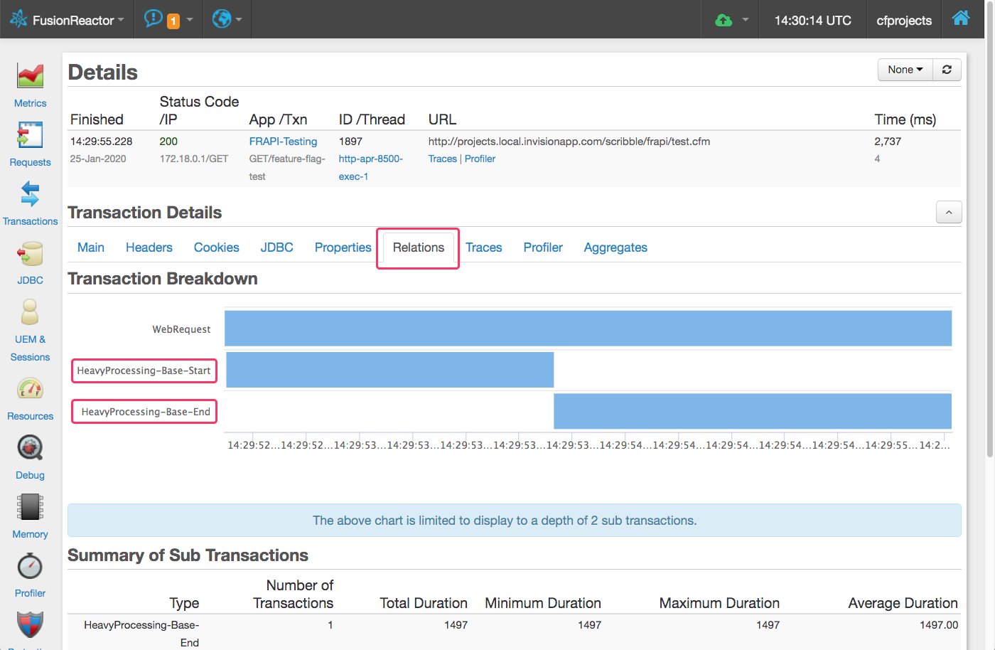 In my demo, each branch of the simulated feature flag is further segmented into two sub-transactions. In the Standalone dashboard, these sub-transactions are visible in the "Relations" tab of a given Transaction: