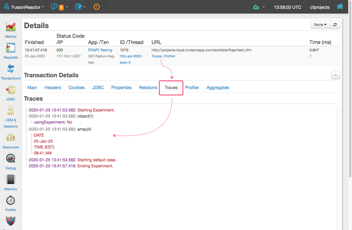 The .trace() method allows you to log arbitrary time-stamped values along with the request. As you can see from my example, I'm logging a String, a Struct, and an Array. Each of these values is handled properly by the FusionReactor API and is rendered within the "Traces" tab of a Transaction detail: