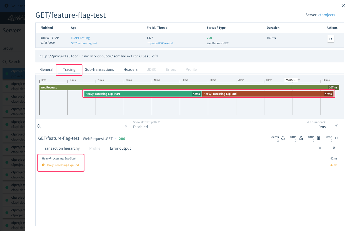This experiment works by proxing the CFThread tag and then using a callback to invoke the asynchronous logic within an explicit Transaction. This gets the asynchronous code to show up in the general Transactions list in the FusionReactor dashboard.