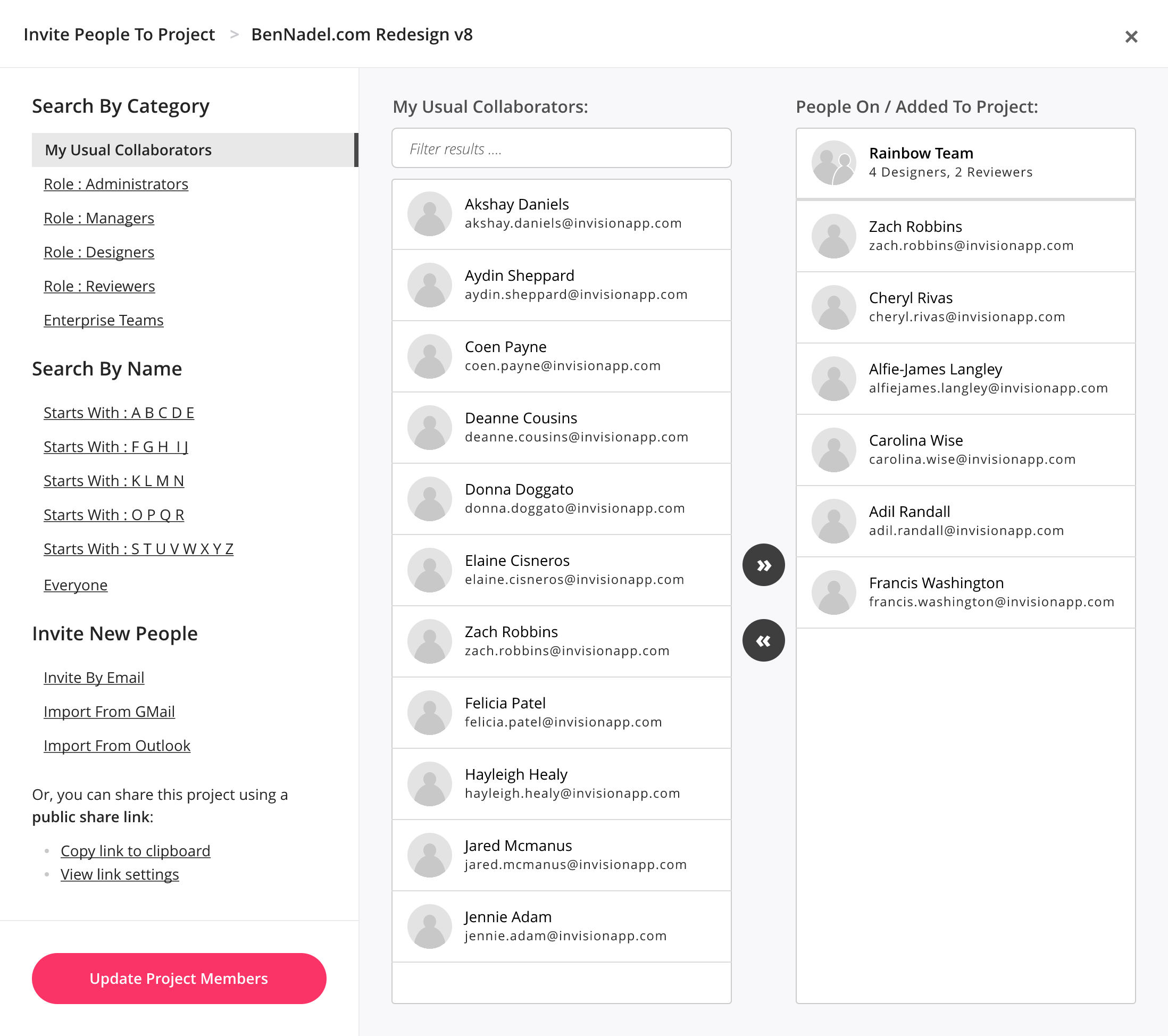 In this case, the left-hand list is the source of potential People; and, the right-hand list is the list of People you want on your project. Again, I find this type of experience very easy to understand since the selected People are singled-out and rendered separately.