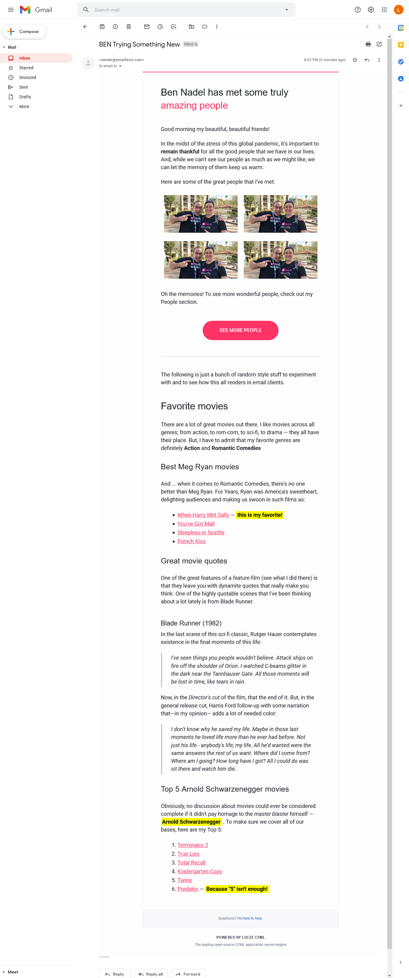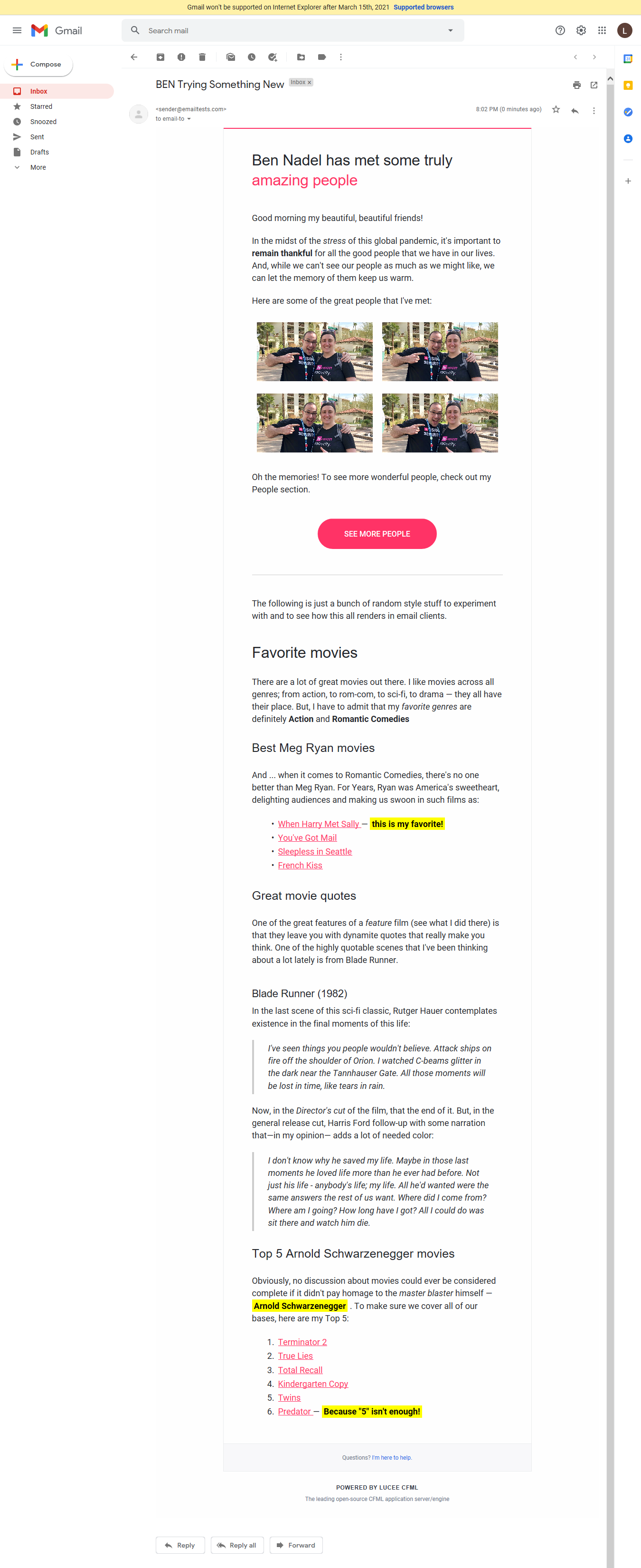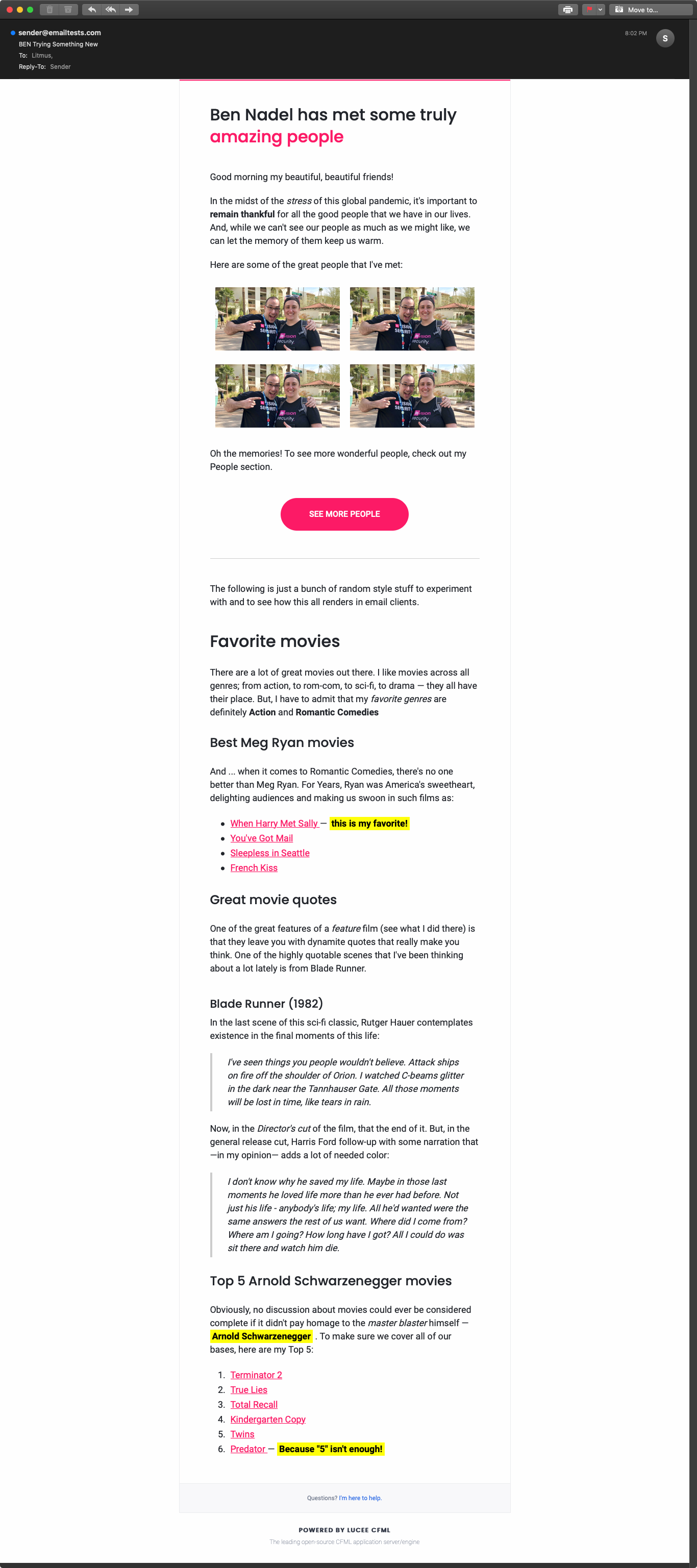 The power of the DSL - and the ColdFusion custom tags - is that even this simple markup allows us to create the following rich HTML-based email experience: