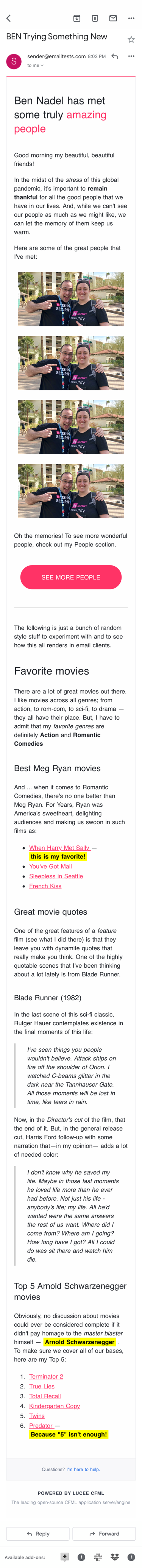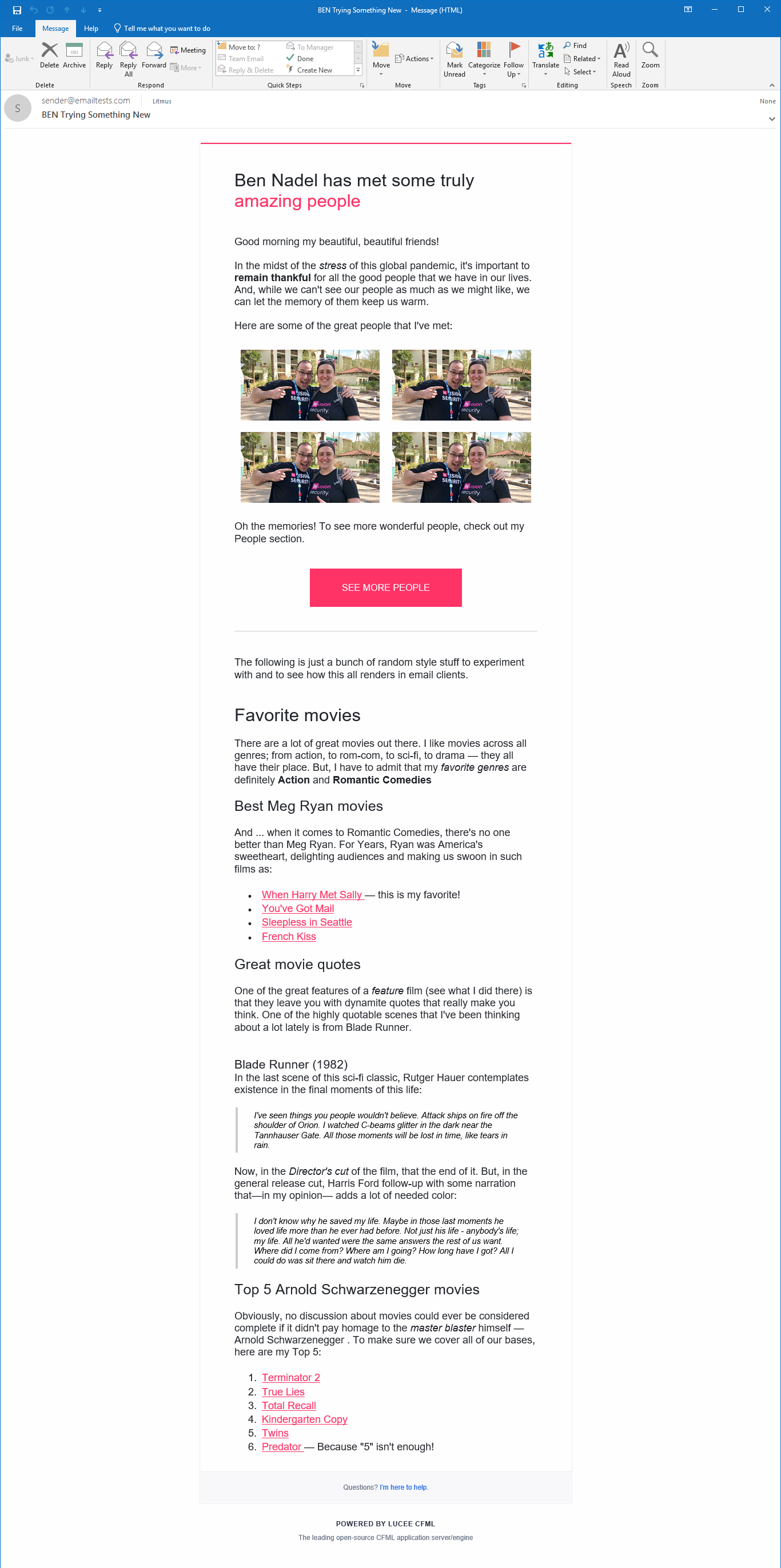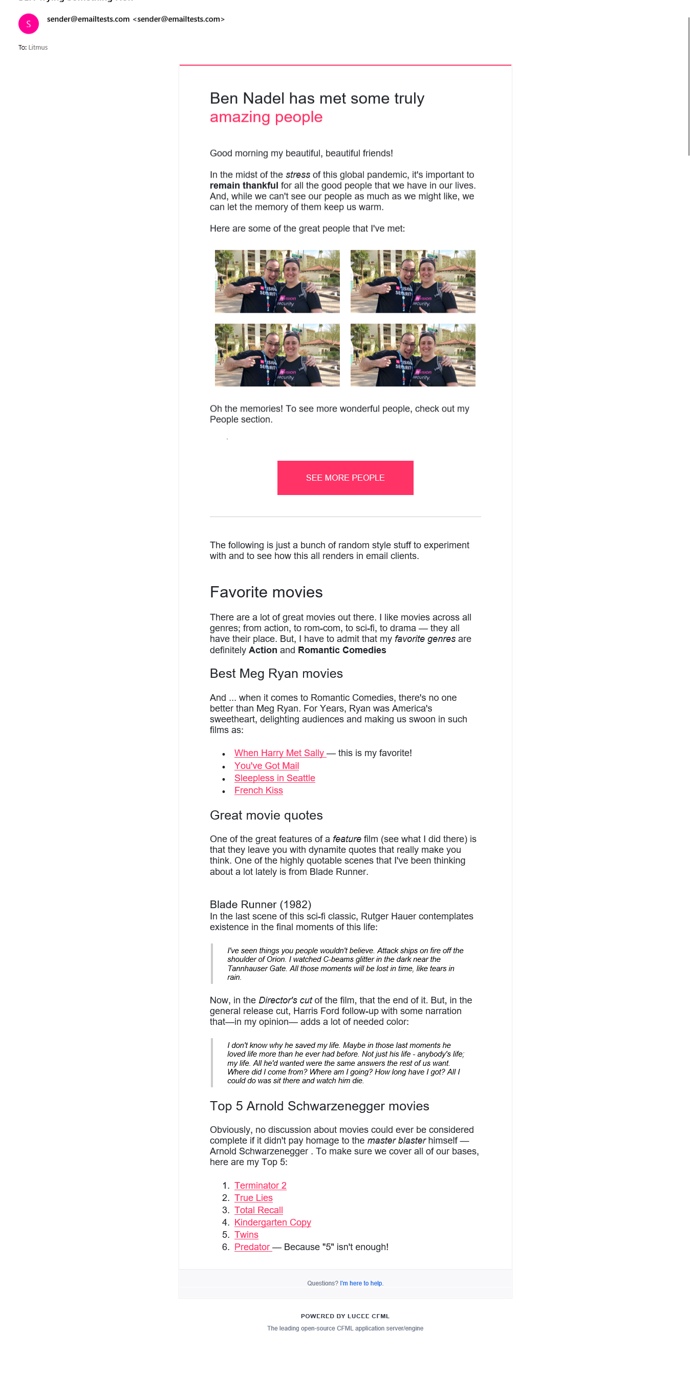But, thanks to this budding abstraction of ColdFusion custom tags, if I test the above email using Litmus, here's what we get in a handful of different email clients: