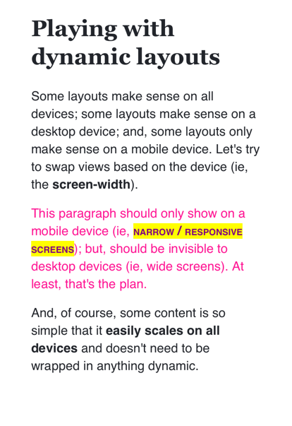 To see this in action, let's look at an example in which we have one paragraph that is show on desktop; and, a completely different paragraph that is shown on mobile: