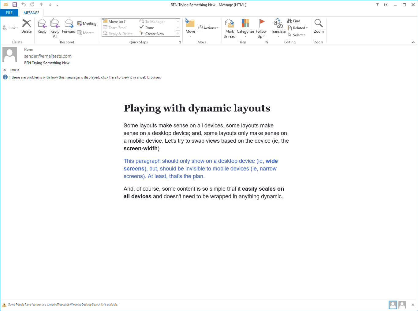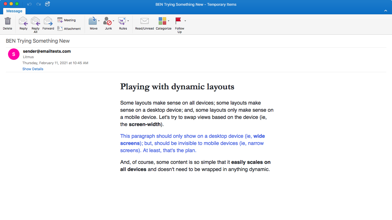 As you can see, the blue-text shows up only on the Desktop devices; and, the pink-text shows up only on the Mobile devices. It even works in Outlook 2013!