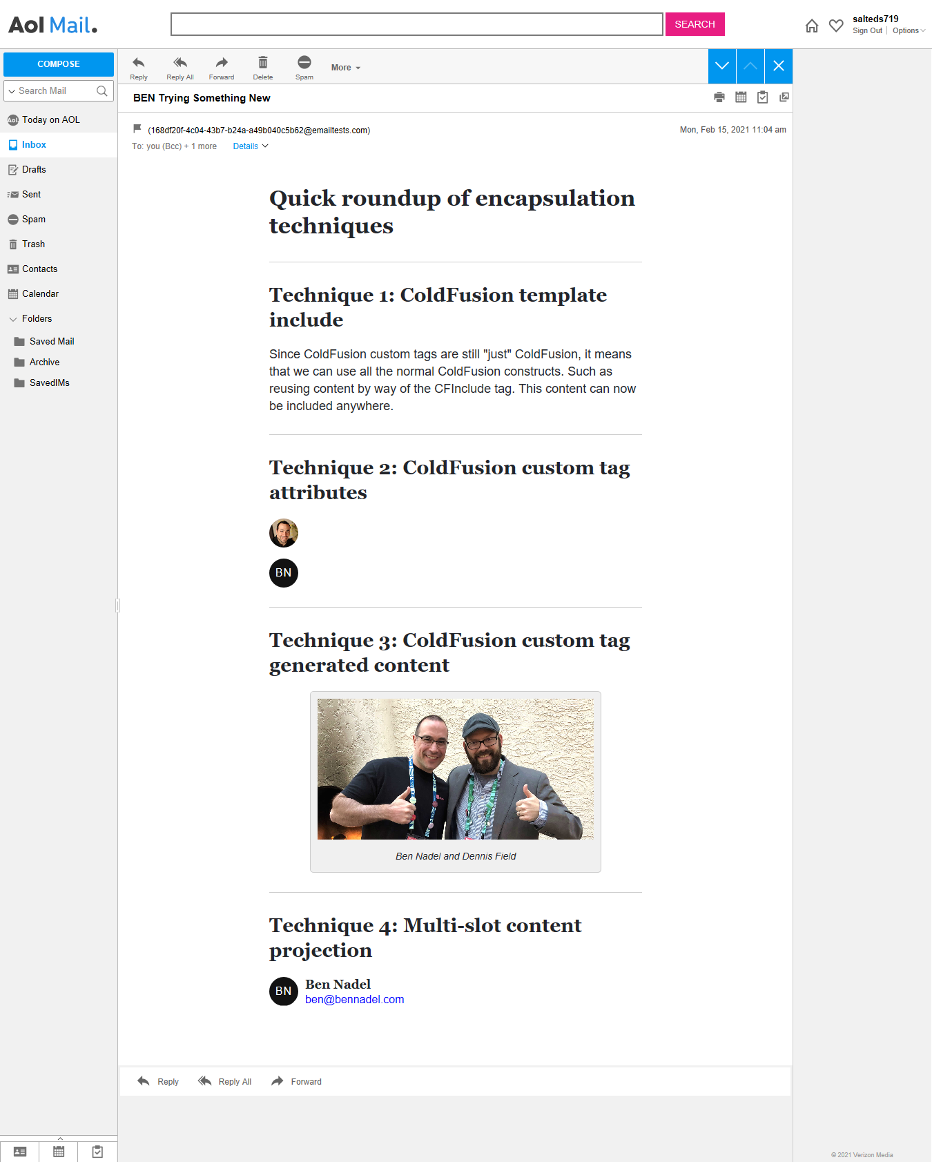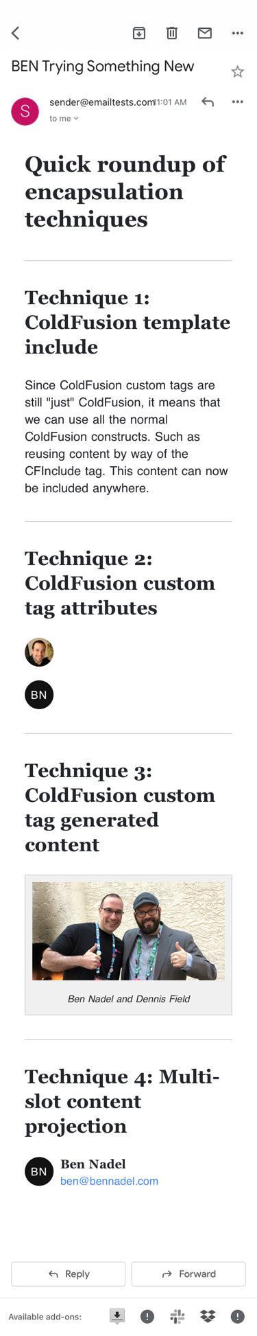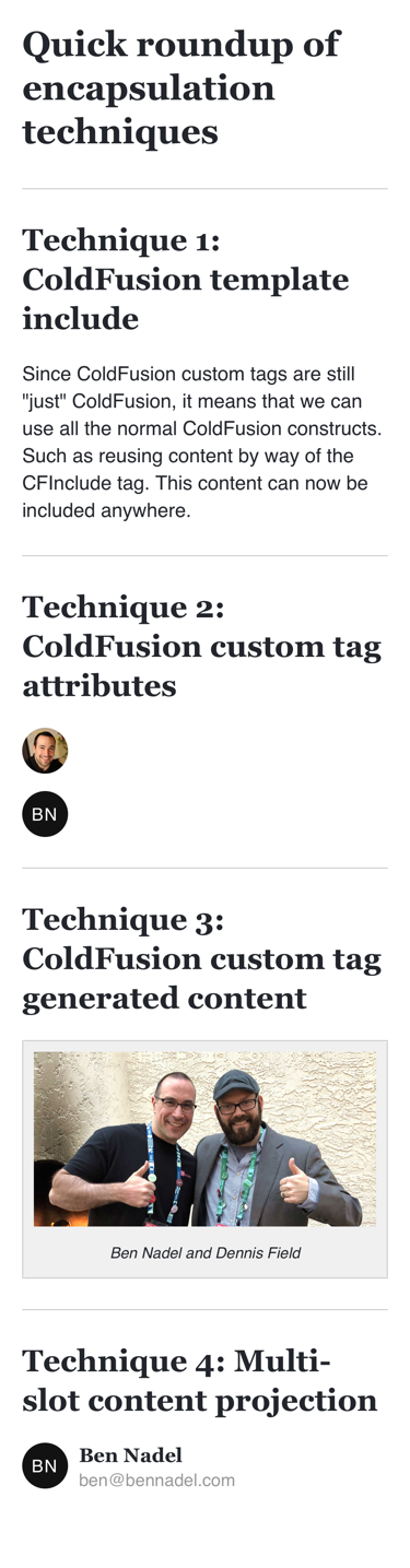 I've been making some wonderful progress on my ColdFusion custom tag DSL (Domain Specific Language) for HTML emails! We've looked at how HTML tags are abstracted away; and, how themes can be applied to those HTML tag abstractions; and, how we can apply responsive styling on mobile email clients; and, how we can add support for Dark Mode; and, how we can use advanced content projection techniques to build complex widgets. So, this morning, I just wanted to do a quick recap of the various encapsulation techniques that we can use when building HTML emails in Lucee CFML 5.3.7.47.