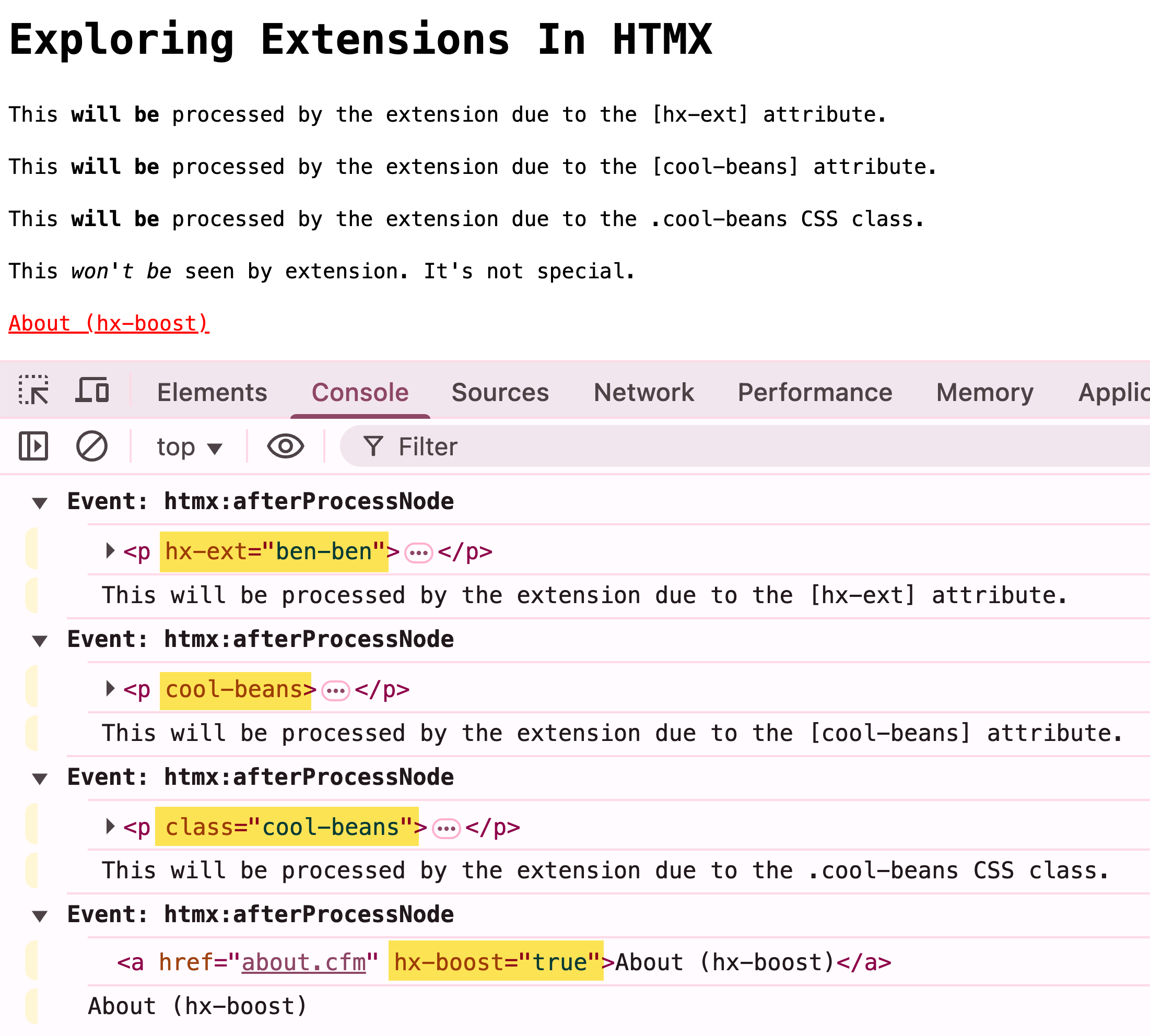 Let's look at a concrete HTMX extension example. This extension, ben-ben, provides additional selectors for cool-beans as either an attribute or a CSS class. Then it logs the textContent of the nodes when the htmx:afterProcessNode" event is emitted: