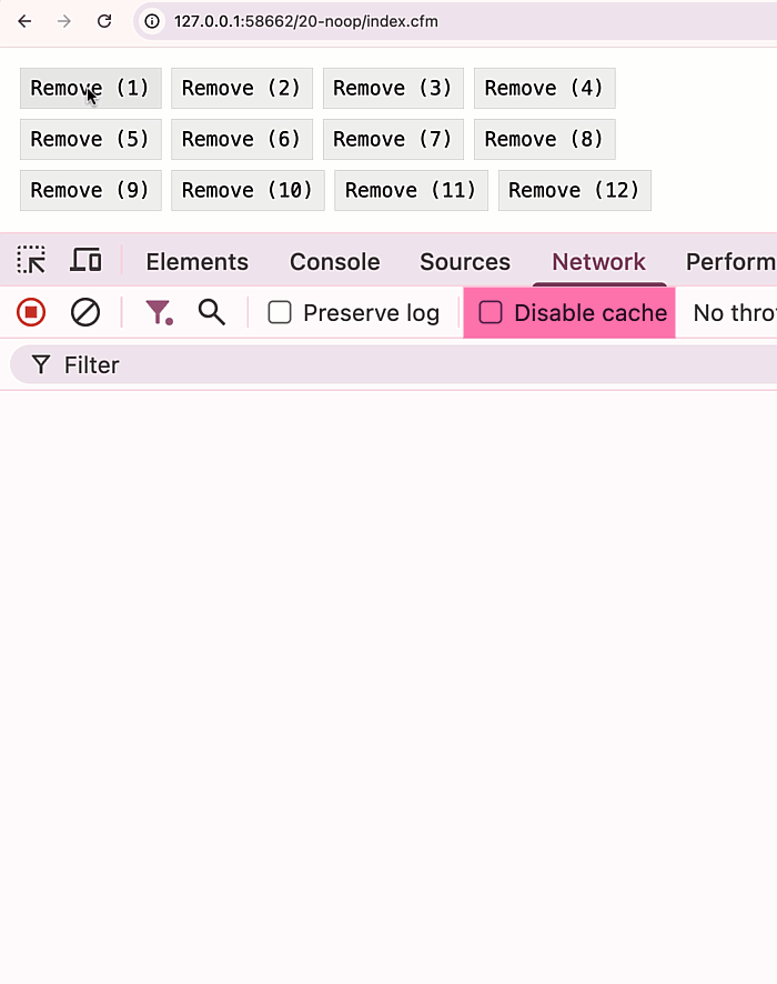 As you can see from the network activity, the browser's natural caching behaviors are in place; and each request to the noContent.cfm end-point is materialized in 1ms, being pulled from cache. This is, from the user's perspective, an instantaneous amount of time; but, it's enough to get HTMX to cache the DOM state. As such, when we click the browser's back button, HTMX will restore the previous DOM state, including the button that we just removed.