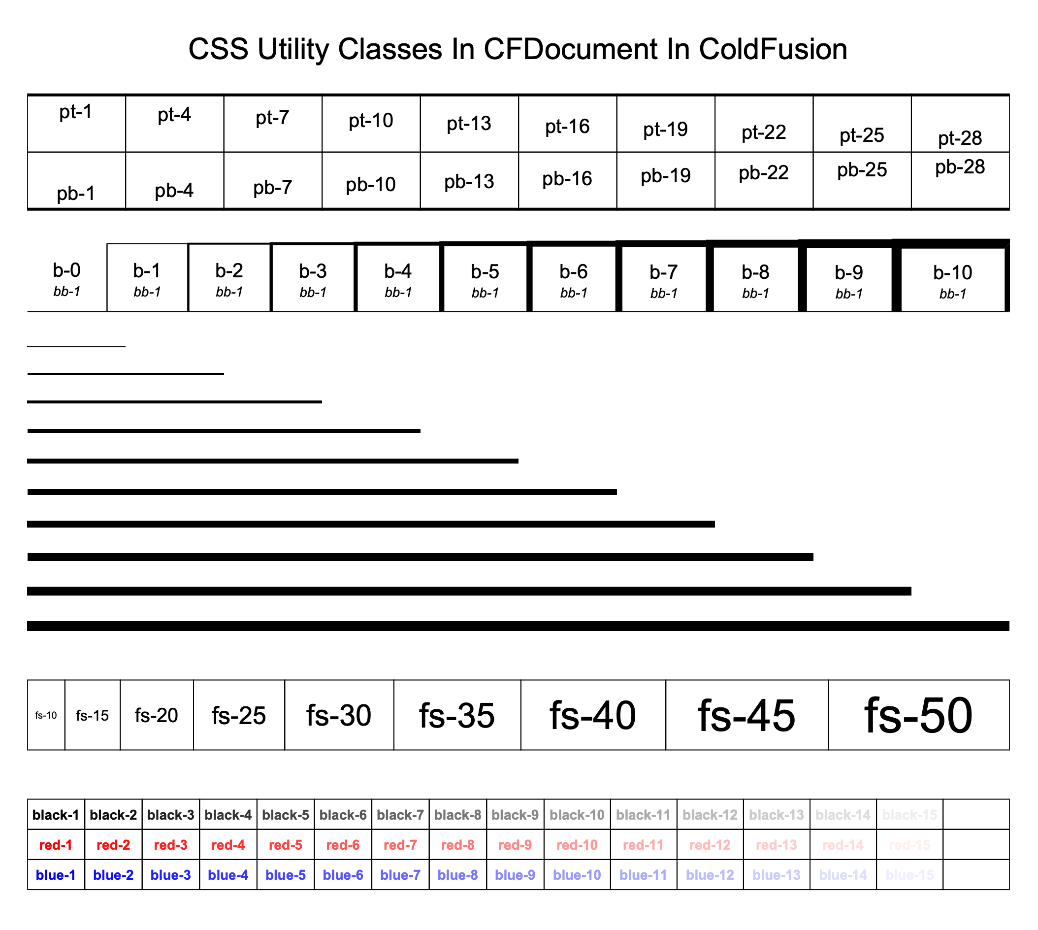 Plus, each implementation of CFDocument is different. Meaning, the underlying engine in Adobe ColdFusion (ACF) is different than the engine in Lucee CFML; and, the Lucee, itself, has two different engines: "modern" and "classic". So, what I'm demonstrating in this post isn't a specific set of utilities, but rather, an approach to building CSS utility classes.