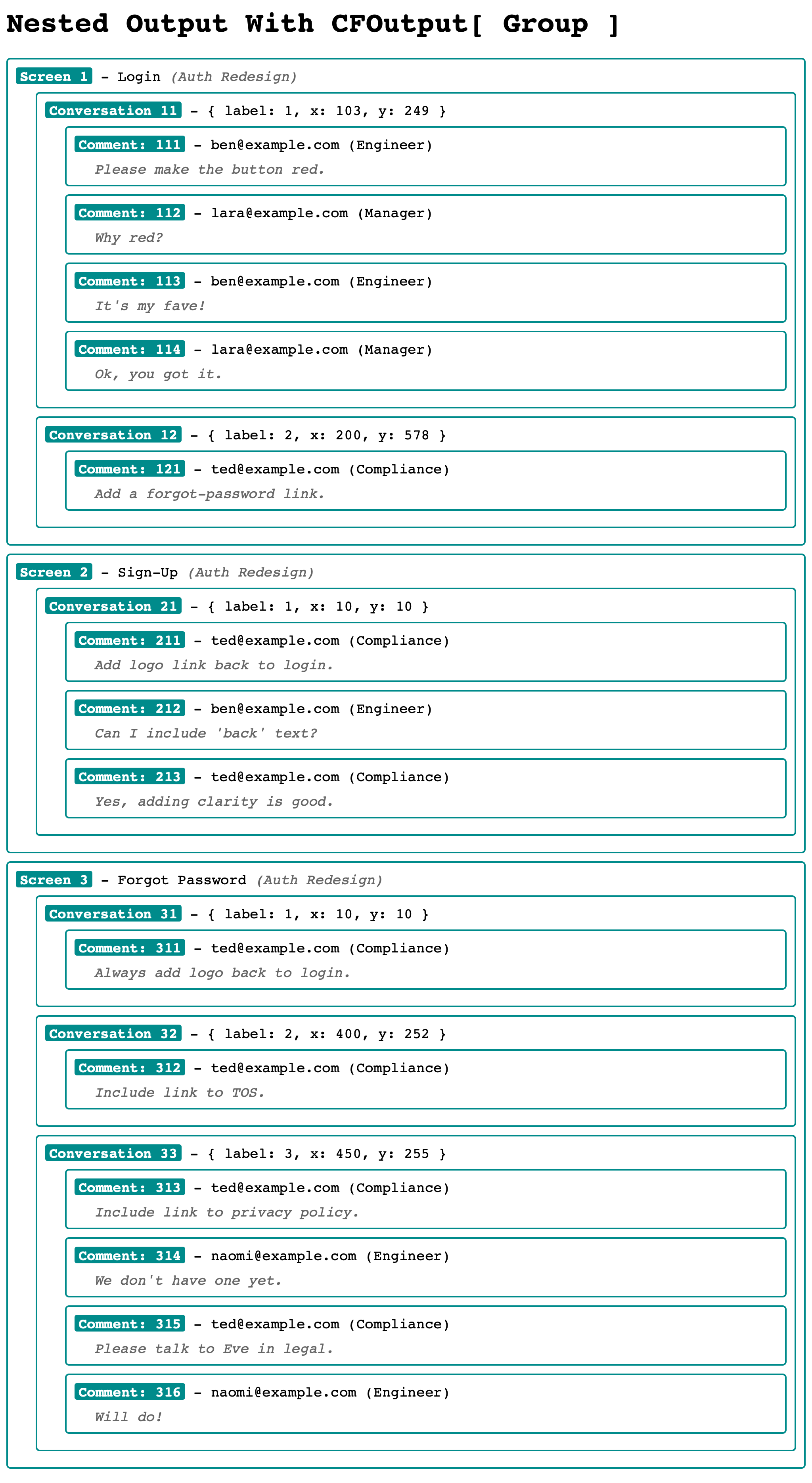 Aside: I almost never use this particular mechanic because Adobe ColdFusion (even as of 2025) doesn't allow this to be done within the context of a non-grouped CFOutput. Meaning, if the entire page is wrapped in a <cfoutput> tag, which is generally my approach to CFML templates, Adobe ColdFusion will throw an error about illegal nesting when I try to use the <cfoutput[group]> syntax farther down in template.