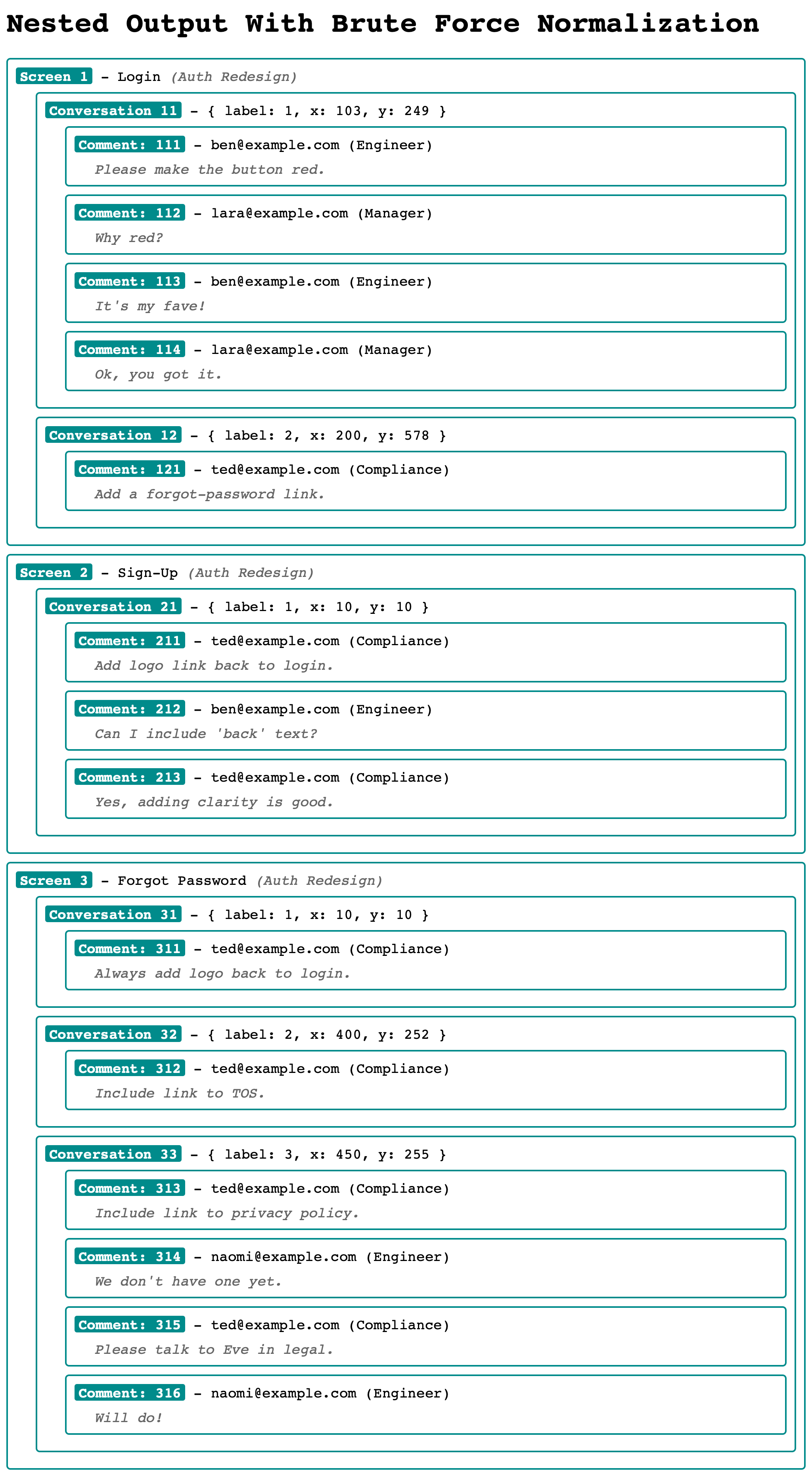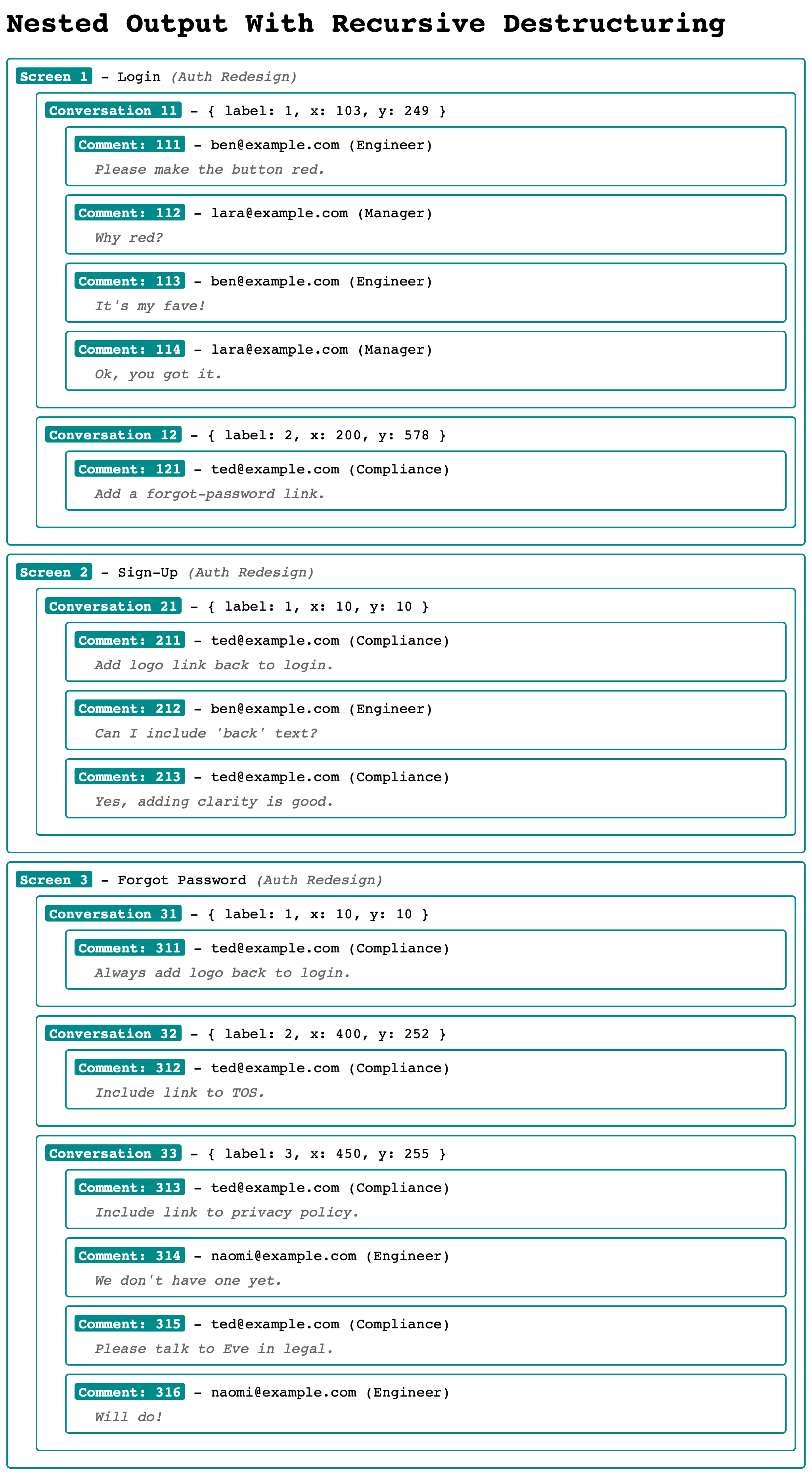 The sample data takes inspiration from my InVision days, where we had "projects", which contained "screens", which contained "conversations", which contained "comments", which contained "users". My sample query (records) is the simulation of an INNER JOIN across these various constructs: